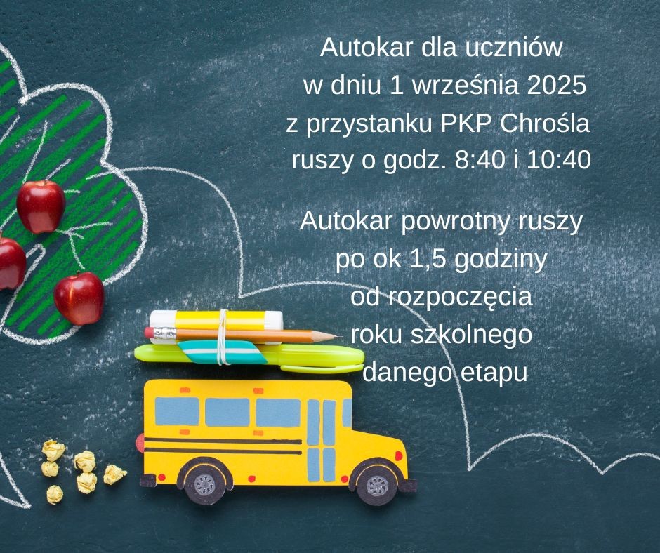 Autokar dla uczniów w dniu 1 września 2025 z przystanku PKP Chrośla ruszy o godz. 8:40 i 10:40.