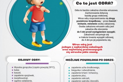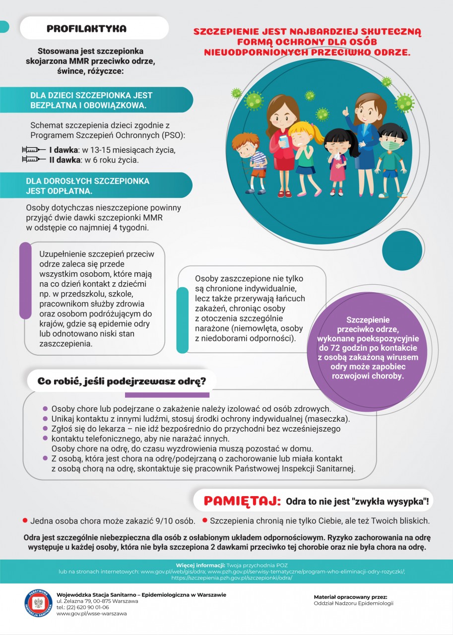 w związku ze zbliżającym się nowym rokiem szkolnym 2025/2026 oraz niewystarczającym stanem zaszczepienia populacji dzieci i młodzieży przeciwko odrze (w woj. mazowieckim poziom zaszczepienia dzieci w 3 r.ż. wynosi 89,2%, a w 7 r. ż. - 72,5 % wobec wymaganego poziomu 95%) w celu ograniczenia zachorowań na ww. chorobę w placówkach oświatowo-wychowawczych prosimy o zapoznanie się z ulotką na temat wysoce zakaźnej choroby wirusowej jaką jest ODRA.