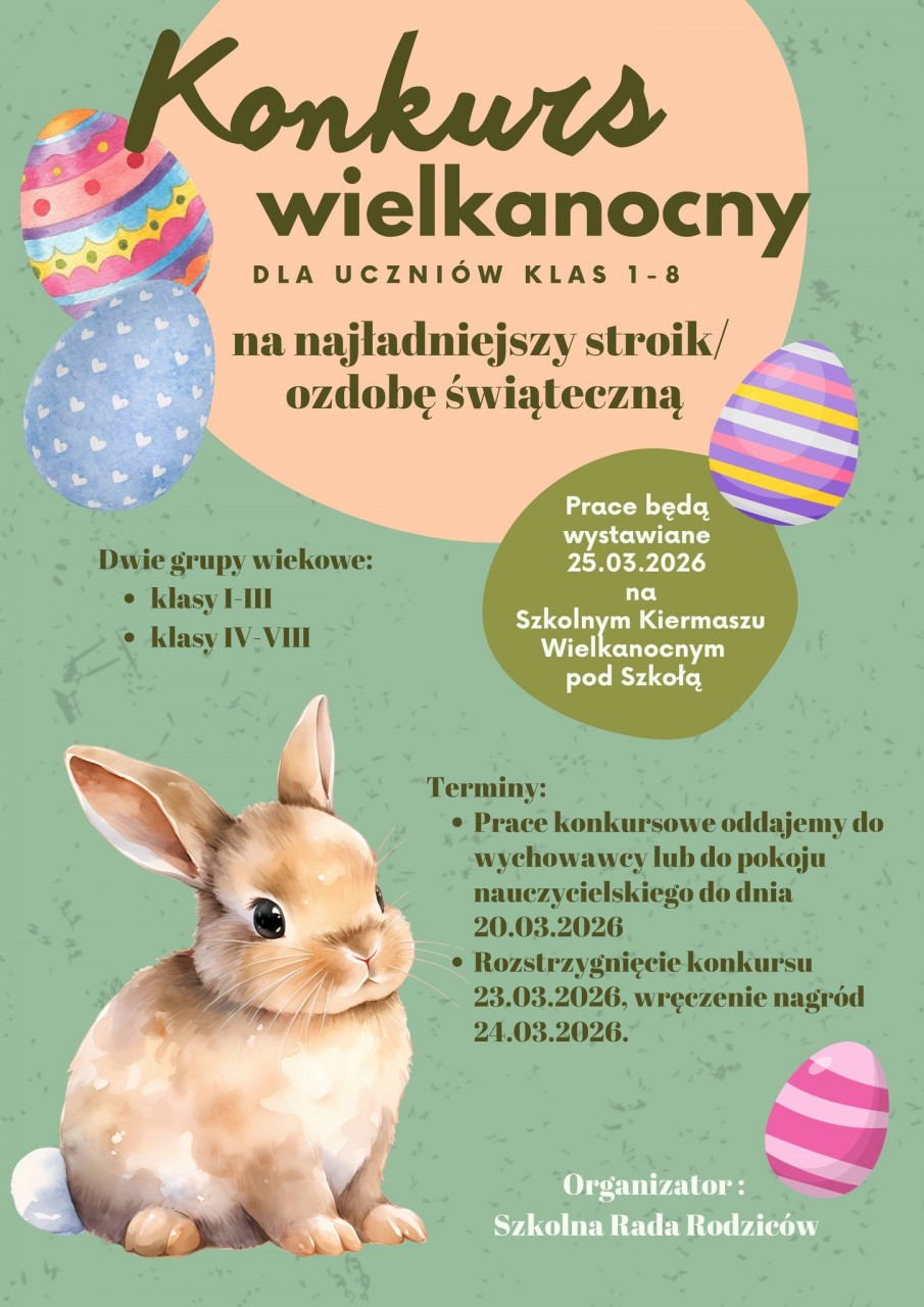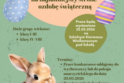 Uczniowie klas 1–8 mogą przygotować ozdobę wielkanocną lub stroik wielkanocny. Zachęcamy do wykazania się pomysłowością i kreatywnością.